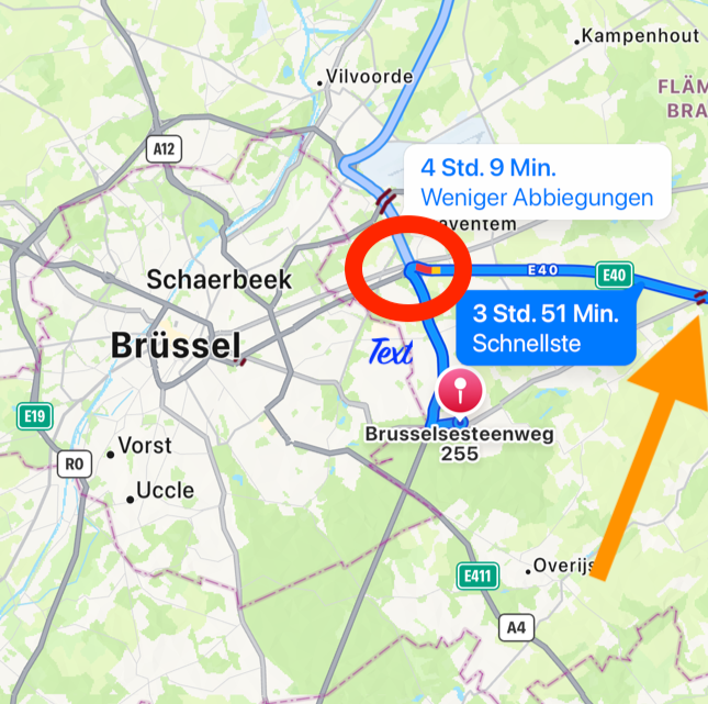 During peak hours, there can be slow-moving traffic at Quatre Bras / Vierarmen (red circle). If traffic is heavy when you exit the highway, please turn earlier into Brusselsesteenweg (orange arrow).